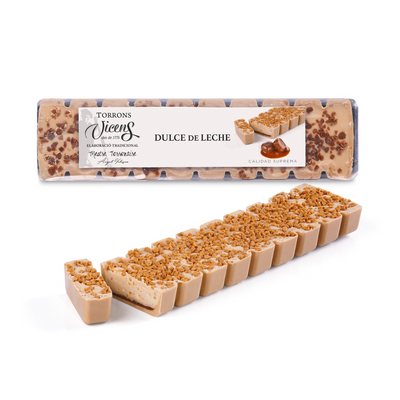 El turrón de Dulce de leche es un exquisito postre de sabor dulce que ha conquistado paladares en todo el mundo. Se crea a partir de un praliné de dulce de leche irresistible y delicioso, que se cubre delicadamente con chocolate caramelizado y se adorna con crujientes de dulce de leche. Esta es una genuina y cremosa fusión de sabores que deleita los sentidos.